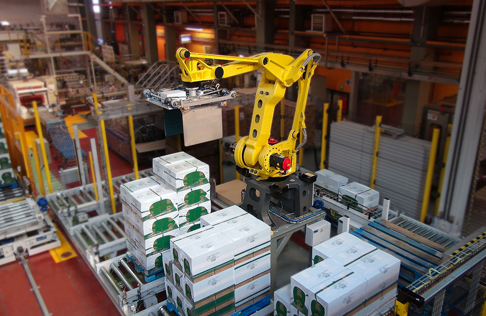 Automatic palletising with a state-of-the-art modern robotic systems capable of covering simultaneously up to 5 production lines for different types of packaging, providing highly accurate pallet loading and reduced maintenance requirements.